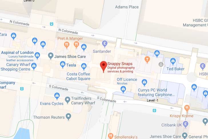 If you’re looking for a photo store in Canary Wharf, choose Snappy Snaps. The Snappy Snaps’ Canary Wharf store is a short walk from the Canary Wharf tube station within Canada Square shopping mall and is open Monday to Sunday. We offer a range of personalised photo products and services including print documents, instant passport or visa photos, instant photo printing, personalised gifts, canvas prints, poster prints and wall art. We can even transfer VHS to digital, restore photos and offer colourisation services to bring your photos to life.