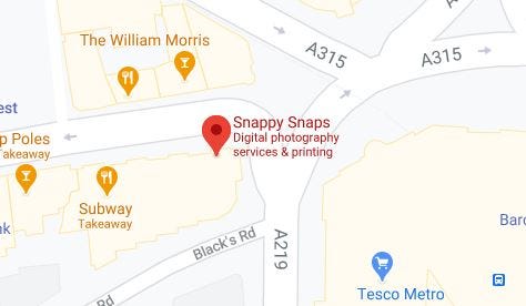 Snappy Snaps Hammersmith is located on the corner of King Street where our bright yellow shop can't be missed, coming off from the A4 onto the A219. Our neighbours are Ladbrokes and we are round the corner from Subway. Directly opposite us is The William Morris Pub. Need a way to get to us? All local transport links are steps away from our store and car parks are close by.